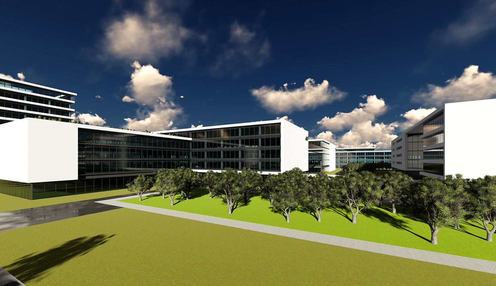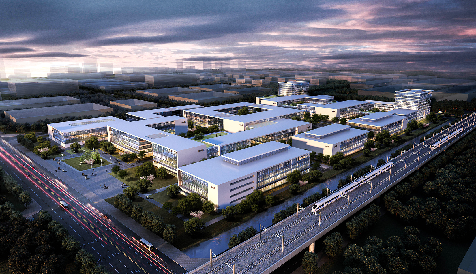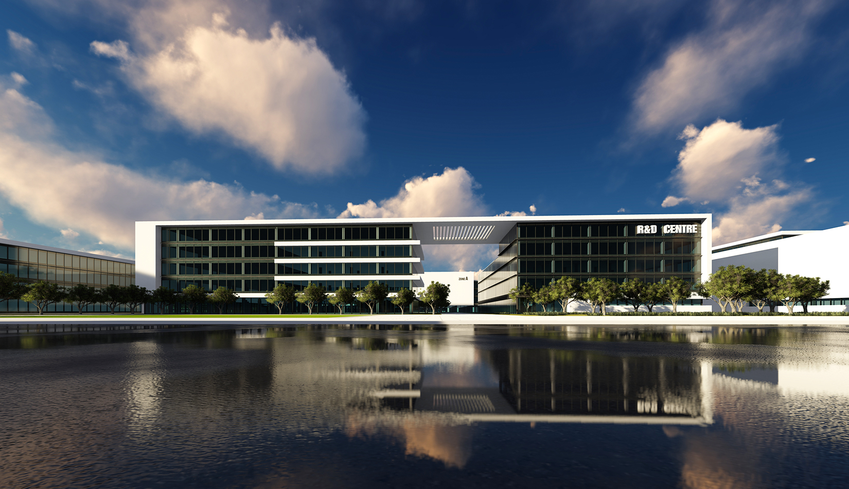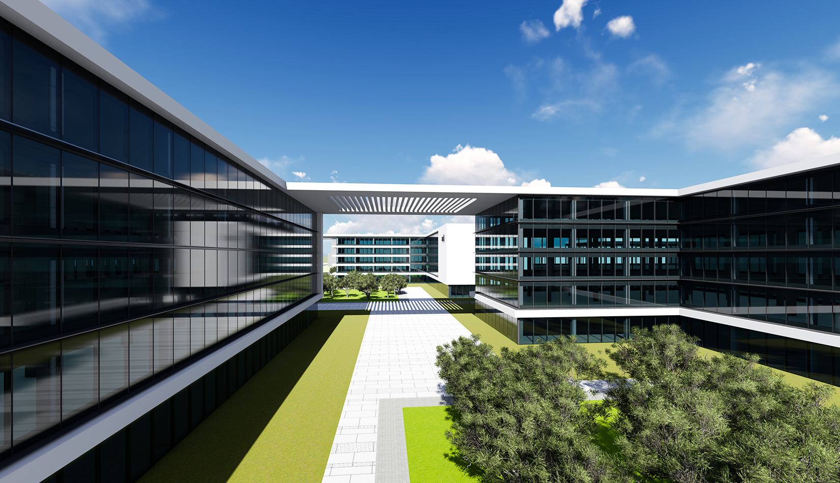 以芯片雙核“互聯(lián)互通” 為基礎(chǔ)概念,轉(zhuǎn)化為建筑空間,形成與世界接軌,和諧五環(huán)的理念。立面上抽象出3D打印機的形態(tài),使建筑具有現(xiàn)代雕塑感。