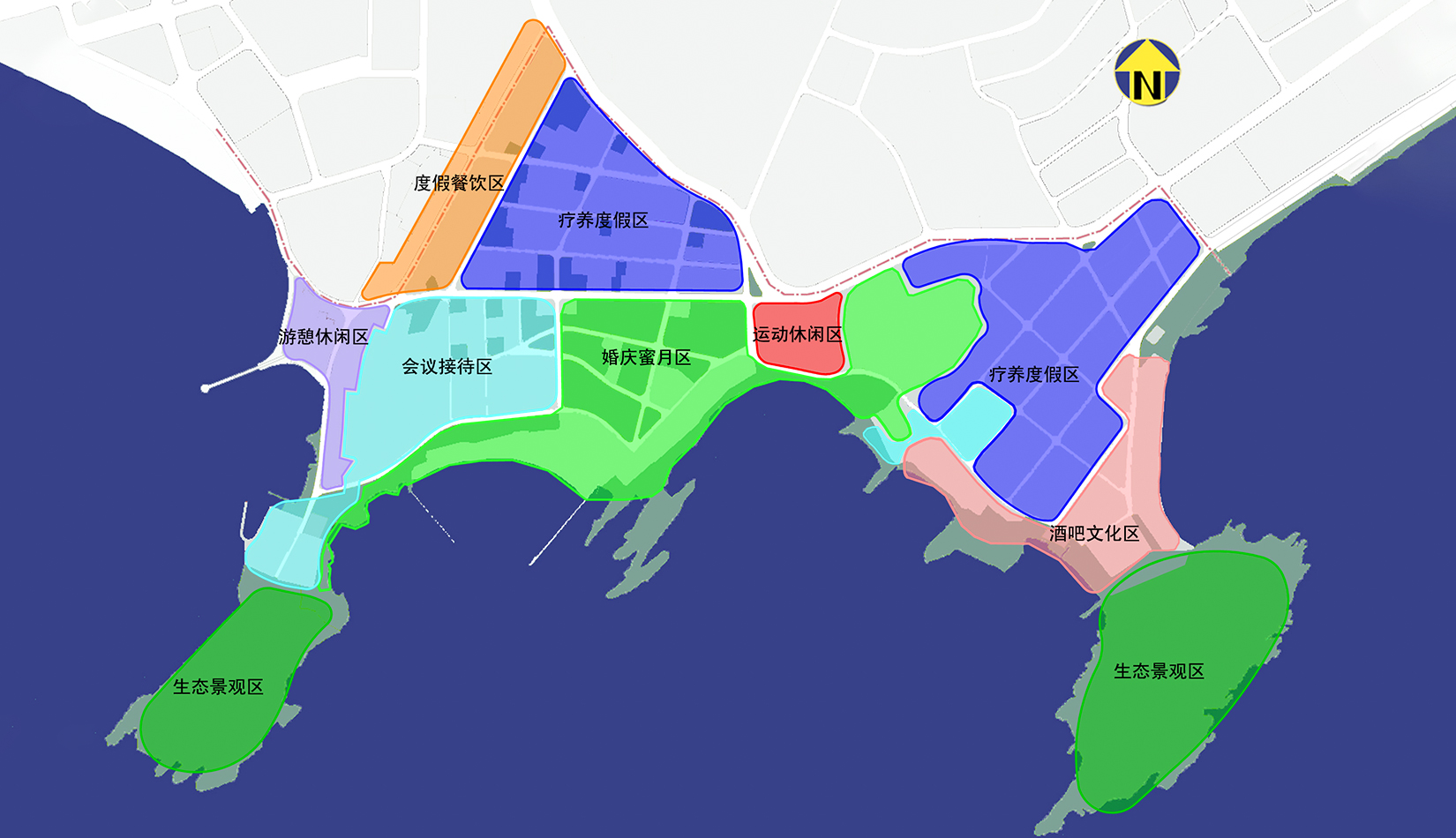 秉持:“整體性積極保護、減法為主、功能提升、公眾開放”的原則,整飭形成度假餐飲、游憩休閑、會議接待、婚慶蜜月、運動休閑、酒吧文化、療養(yǎng)度假與生態(tài)景觀區(qū)。